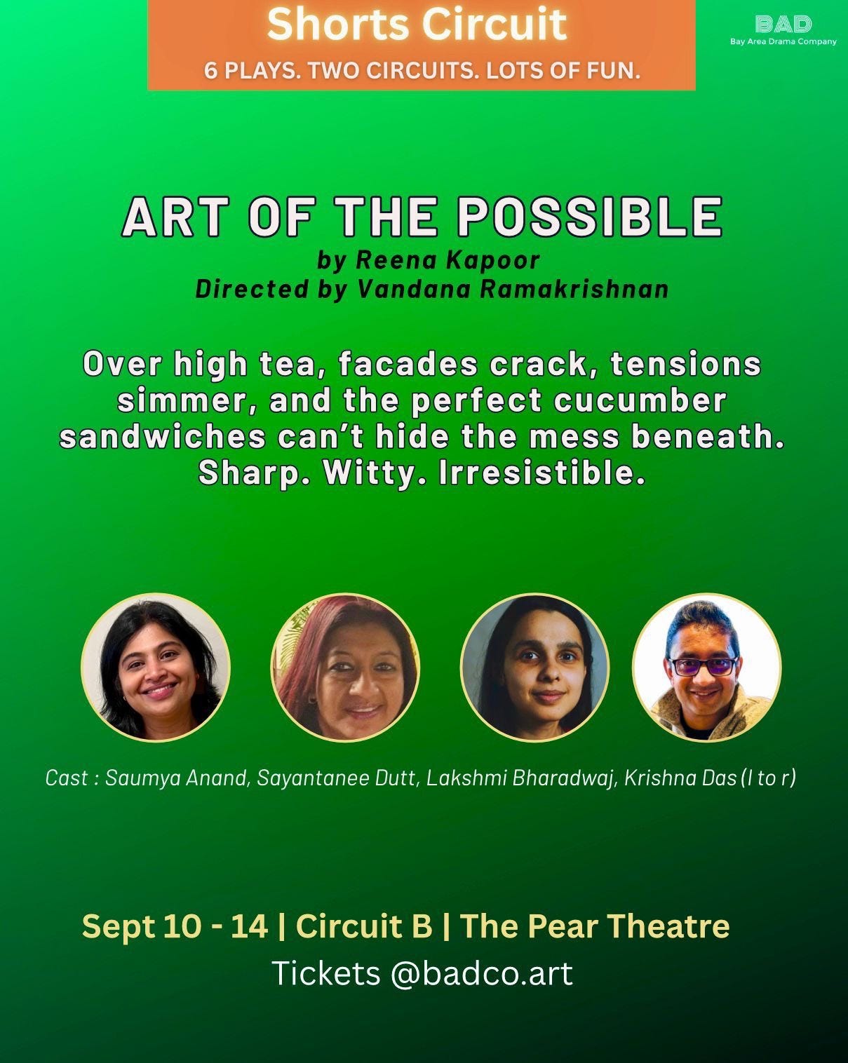 One of my short plays (a comedy) “Art of the Possible” has been selected by the Bay Area Drama company, to be staged in September 11-14th in Mountain View, CA as part of their "Shorts Circuit" showcase in September 2025.